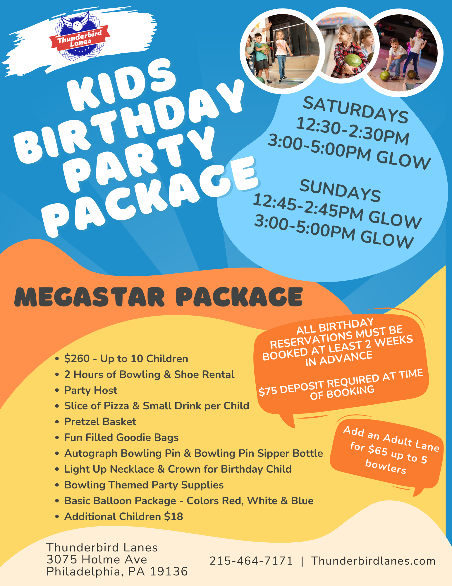 Childrens Birthday Parties are a blast at Thunderbird Lanes. Tons of fun for the kids and stress free for mom and dad. We offer Saturday and Sunday parties from 12:30pm to 2:30pm and 3pm to 5pm. Pump it up with our Rock and Bowl Party offered Saturdays from 3pm to 5pm and Sundays from 1pm to 5pm. The lights are turned off, the music is turned up, light show and black lights come on with Mom approved videos playing on our 10' Drop Down Screens.